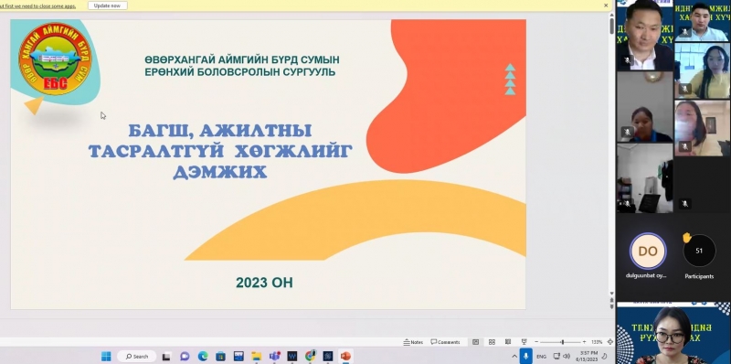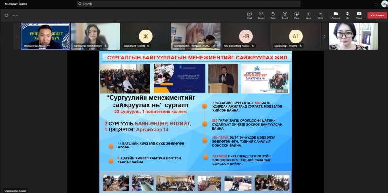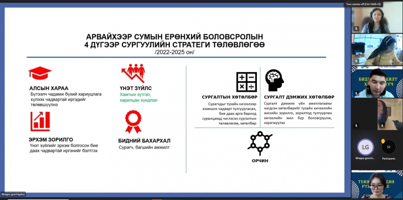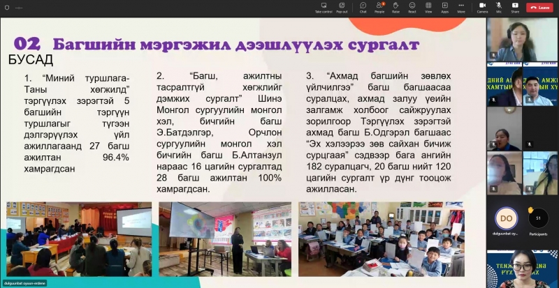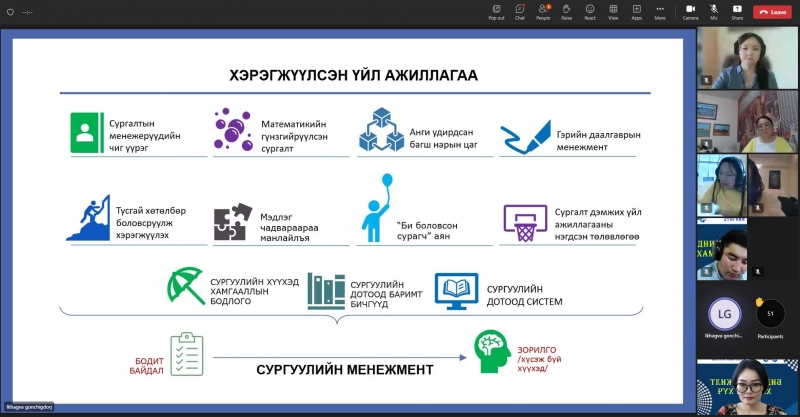2022-2023 оны хичээлийн жилийн сургалт, үйл ажиллагааны онцлог, ахиц амжилт үр дүнг хэлэлцэх, сайн туршлага, үйл ажиллагааг түгээн дэлгэрүүлэх зорилгоор “БИДНИЙ АМЖИЛТ-ХАМТЫН ХҮЧ” тайлангийн хурлыг цахимаар зохион байгуулж байна.