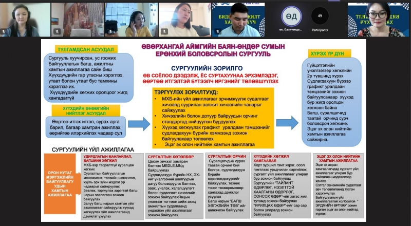Баян-Өндөр сумын ЕБ-ын сургуулийн захирал Д.Мөнхбаяр, Өлзийт сумын ЕБ-ийн сургуулийн нийгмийн ажилтан Т.Ундармаа нар “Сургуулийн менежментийг сайжруулах жил”-ийн зорилт, асуудал, шийдэл, ахиц амжилт, үр дүнгийн талаар мэдээлэл хийж, харилцан туршлага солилцлоо.